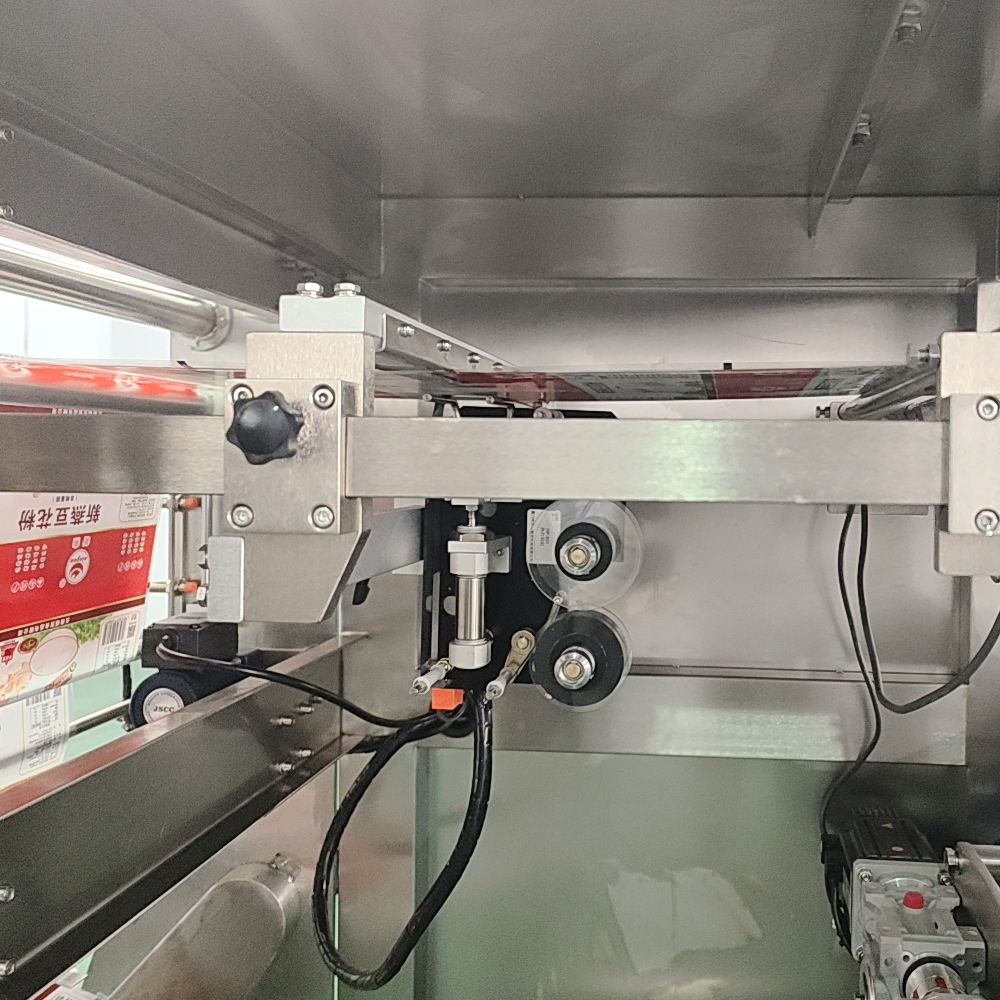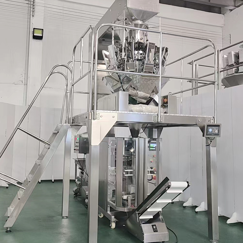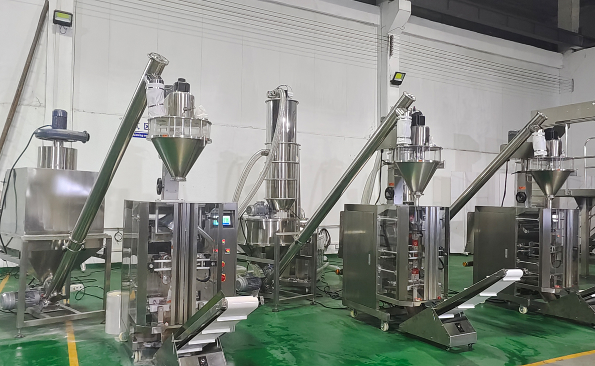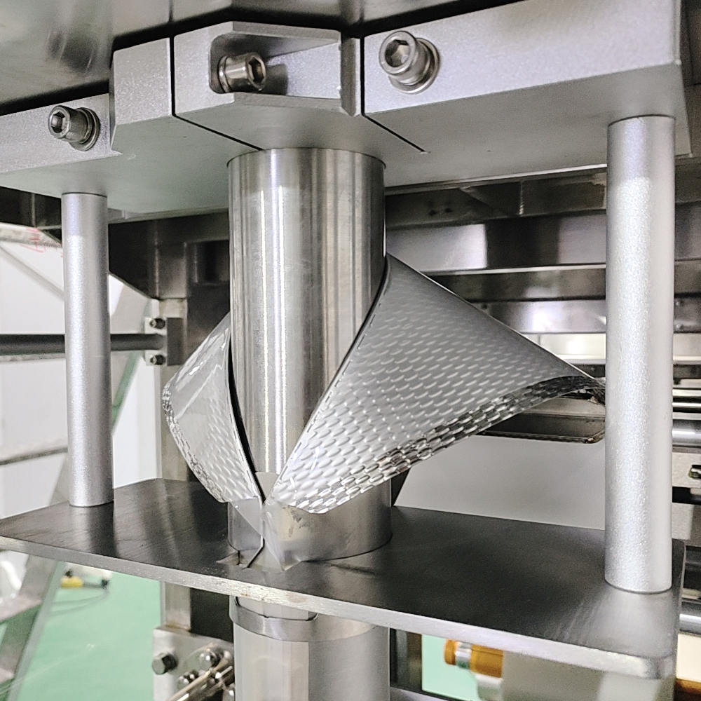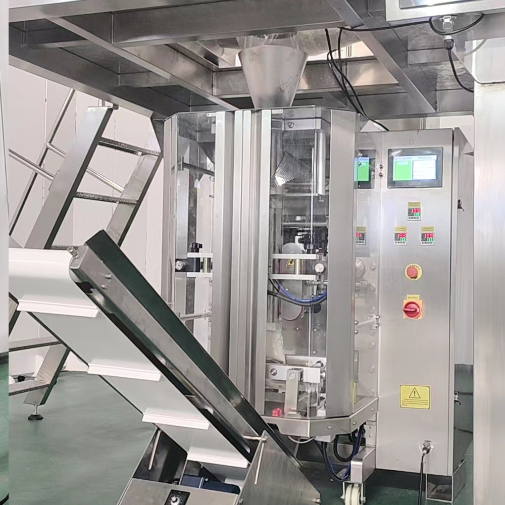 Main Packing Machine VFFS type with function: Date printing, Bag forming, filling sealing, and output.